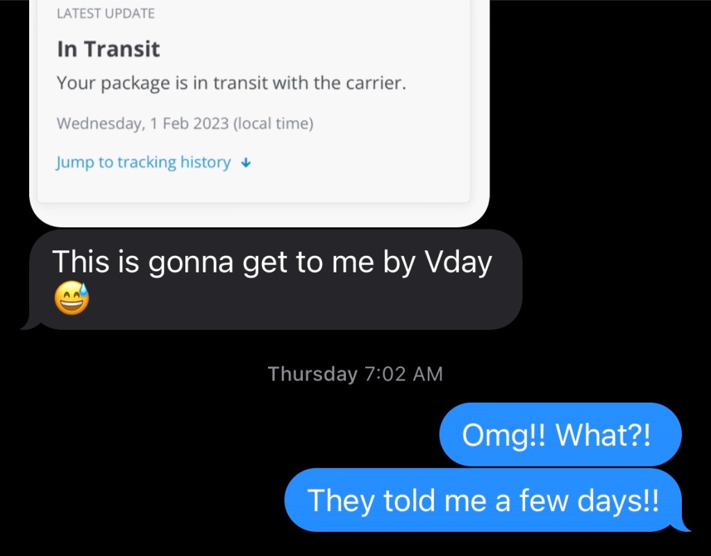 To K’s horror, the information showed that the merch wouldn’t reach until too close to V-day. But, thankfully, it reached within 5 days, as T had been promised by the USPS. And so, mail did seem to be a very good option for them.